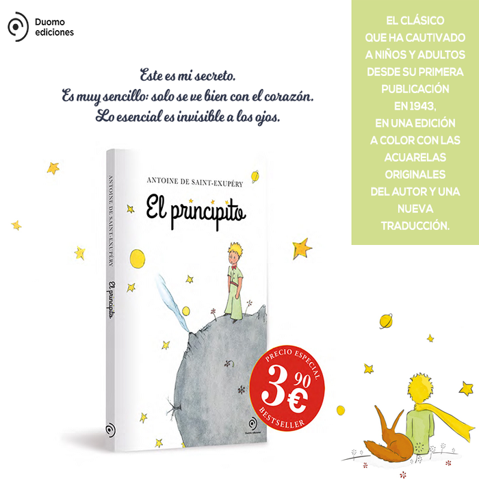 Vuelve, El Principito, el clásico que ha cautivado a niños y adultos desde su primera publicación en 1943, en una edición a color con las acuarelas originales del autor y una nueva traducción. Además, ahora a un precio muy especial de 3,90€.
